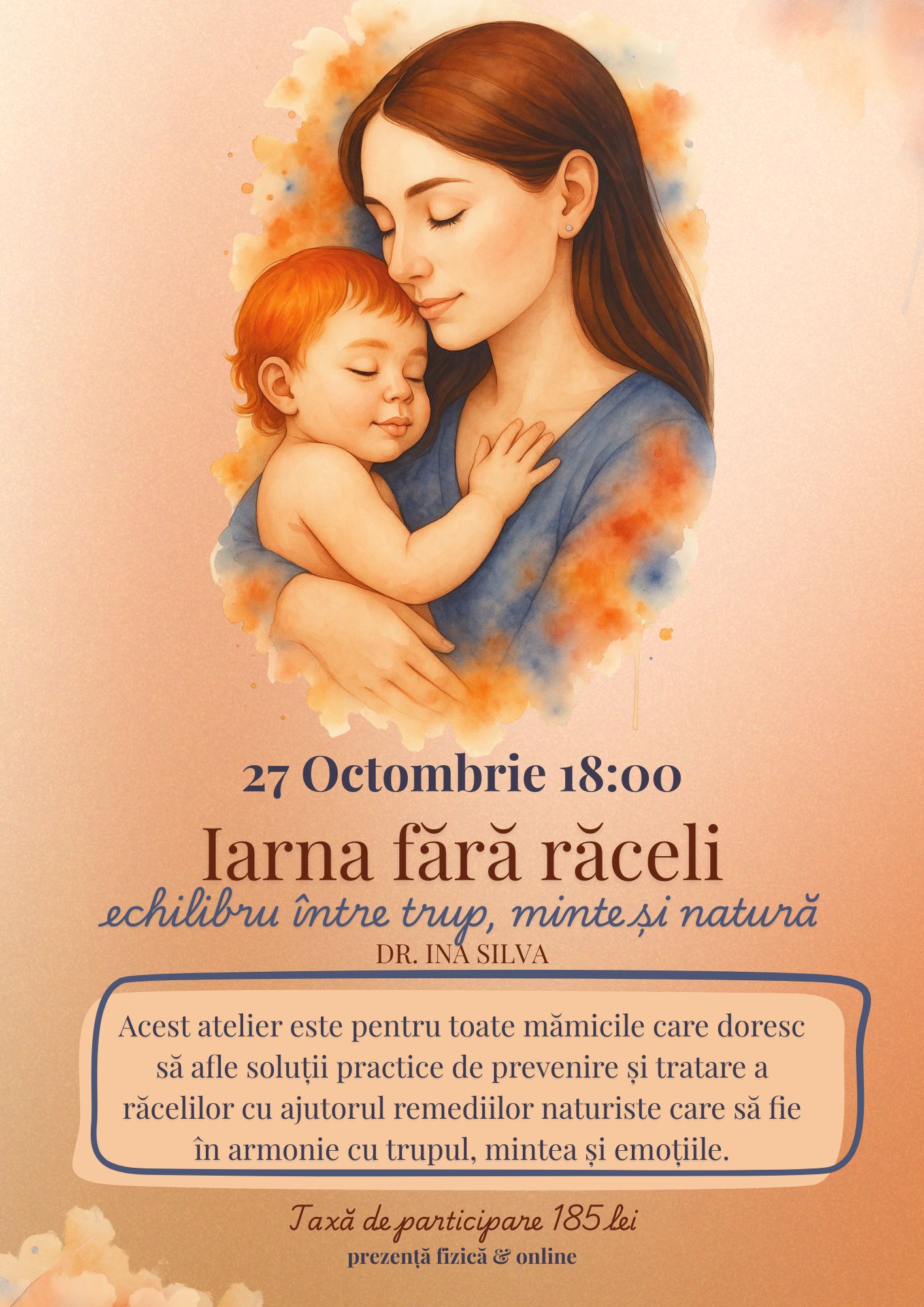 Acest atelier este pentru toate mămicile care doresc să afle soluții practice de prevenire și tratare a răcelilor cu ajutorul remediilor naturiste și care să fie în armonie cu trupul, mintea și emoțiile. Atelierul va avea lor în Oradea dar doritorii vor putea participa atât online cât și fizic. Lunar se vor organiza astfel de ateliere împreună cu doamna doctor Ina Silva pentru ca dorim să învățăm împreună să prevenim și să tratăm problemele de sănătate observând emoțiile și semnalele corpului înaintea de a se îmbolnăvi.